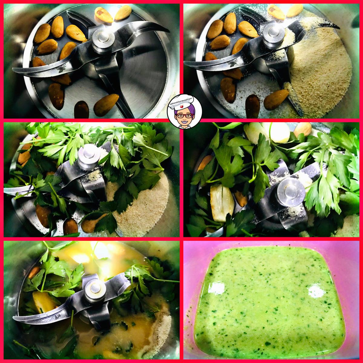 En el mismo aceite doramos un poco el ajo y mientras ponemos en el vaso de la batidora en mi caso thermomix las almendras, el pan rallado, el perejil, el ajo y cuatro cucharadas de caldo de pescado. Trituramos y reservamos