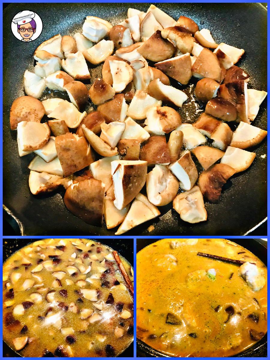Ahora teniéndolo ya todo listo es el momento de poner en la cazuela el sofrito, el palo de canela, las setas, el caldo de pescado y salpimentamos