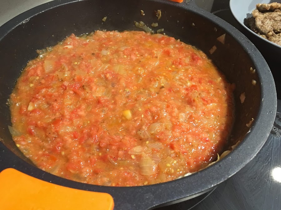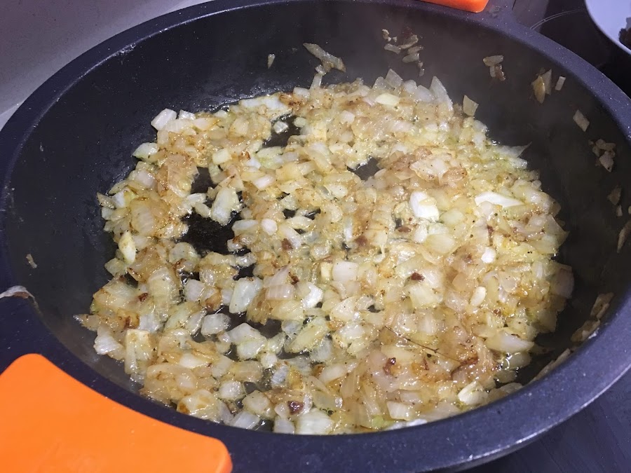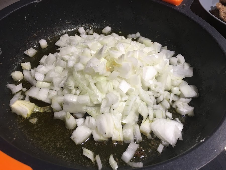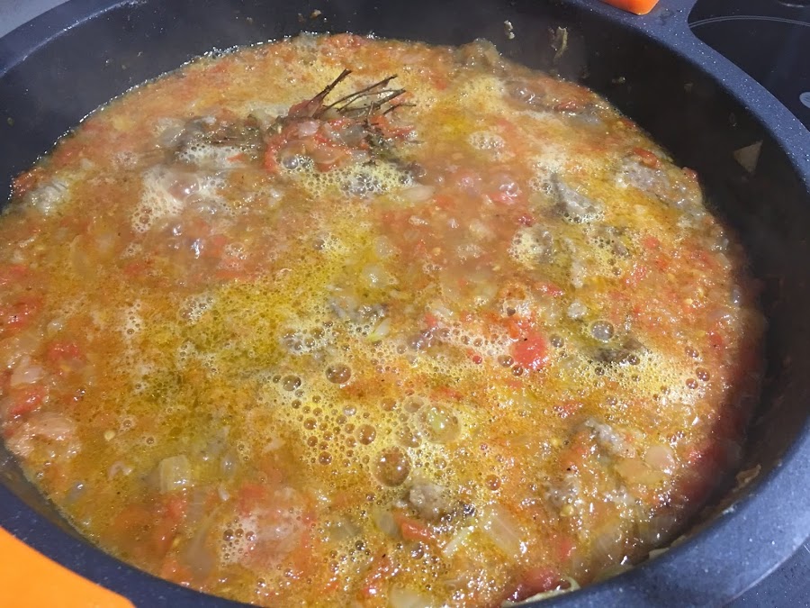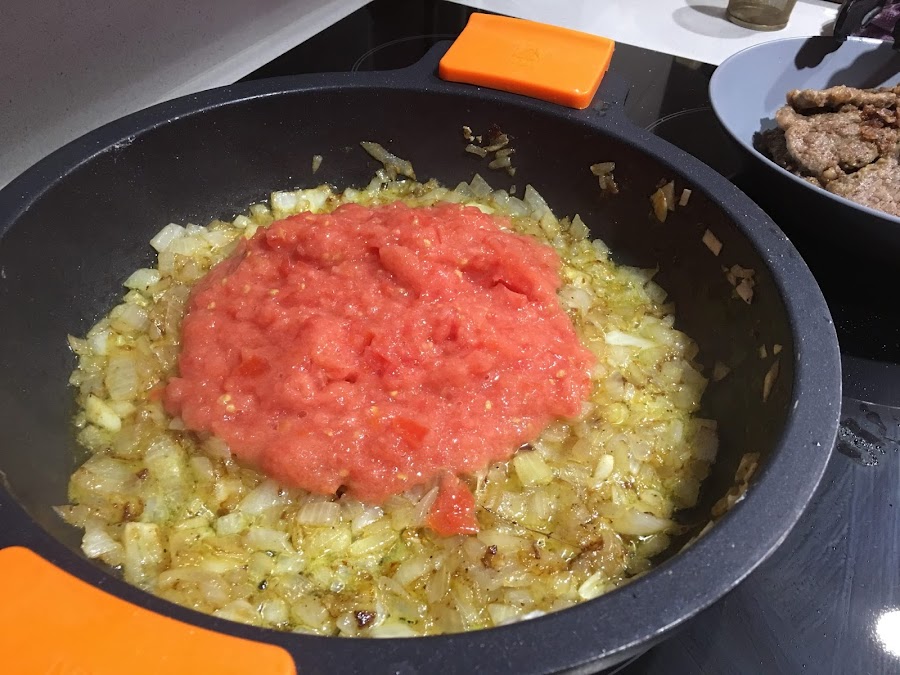 2. En la misma cazuela donde hemos marcado la carne ponemos la cebolla blanca a brunoise y doramos a fuego lento. Una vez pochadita añadimos los 3 tomates maduros triutrados. Dejamos que reduzca bien toda el agua del tomate, alrededor de unos 15 minutos a fuego medio.