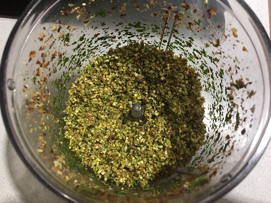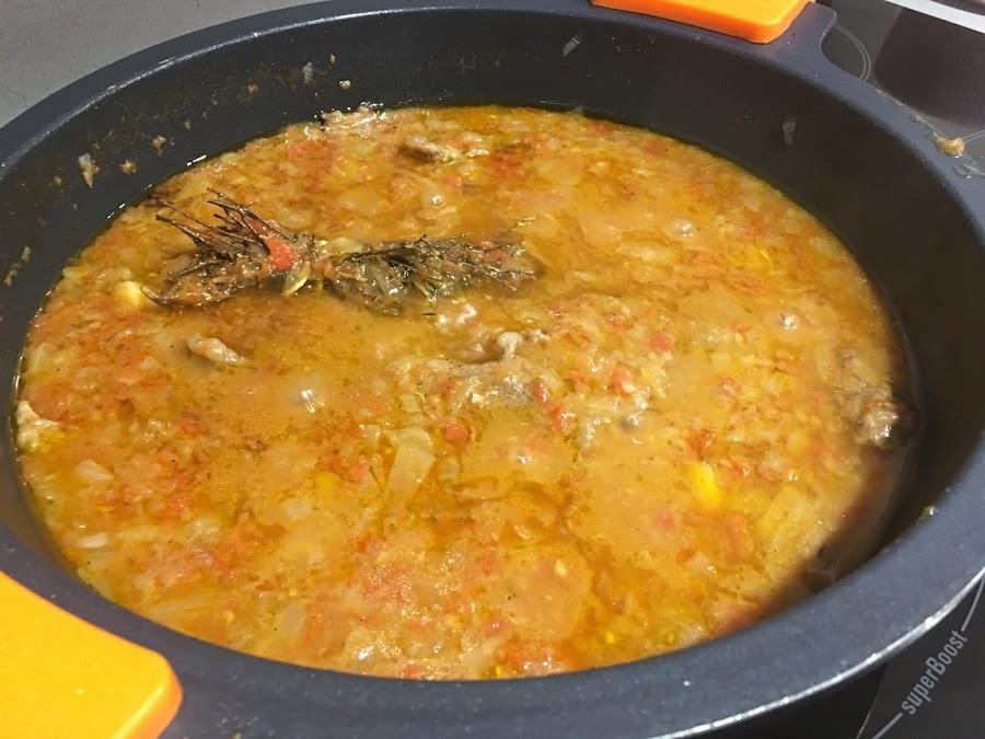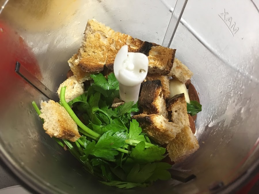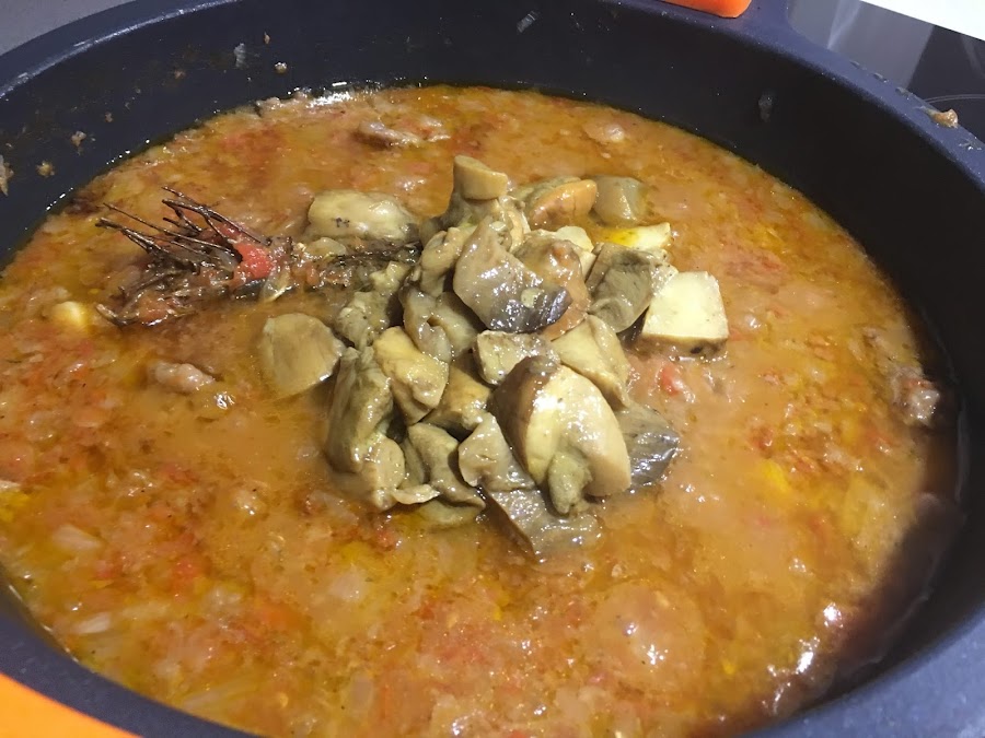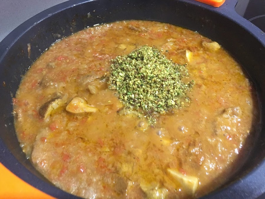 5. Preparamos la picada, trituramos bien todos sus ingredientes, huele de maravilla. La añadimos al guiso y mezclamos. Ayudará a conseguir una salsa con cuerpo y con mucho sabor. Dejamos a fuego lento 10-15 minutos más.