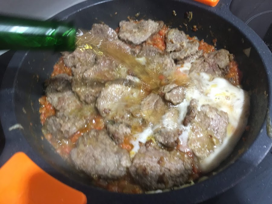 3. Añadimos los filetes sobre la cama de tomate y cebolla, ponemos la cerveza negra, la cantidad necesaria para que cubra la carne, subimos el fuego para que la cerveza pierda el alcohol. A continuación, agregamos el atadillo de hierbas y dejamos a fuego bajo durante 60 minutos.