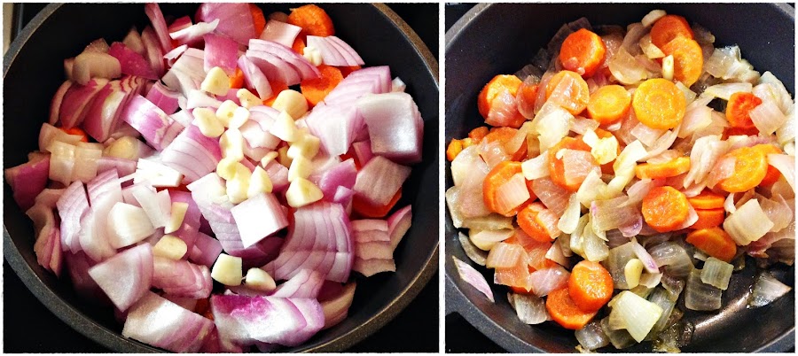 En una sartén, añade 30 ml. de aceite y pon la cebolla picada, la zanahoria laminada y los dientes de ajo.