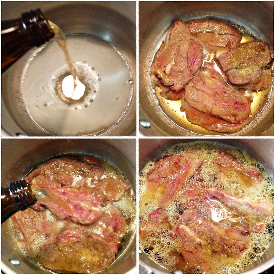Prepara la olla exprés y añade un dedo de cerveza, seguidamente, coloca 4/5 filetes y añade cerveza hasta cubrir la carne.