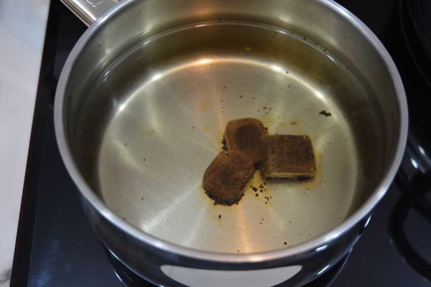 Paso 2 Por otra parte, ponemos un cazo con agua a calentar y ponemos 3 pastillas de caldo concentrado de carne para que se disuelvan y preparar un caldo. Si tenéis caldo de carne casero mejor, solo os propongo una alternativa práctica.