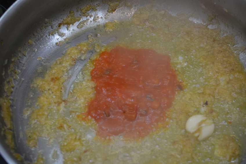 Paso 4 Picamos la cebolla muy picadita, machacamos los 2 ajos pelados y lo ponemos todo en la cazuela con aceite de oliva a sofreír. Con la verdura hecha, ponemos 6 cucharadas soperas de salsa de tomate IBSA.
