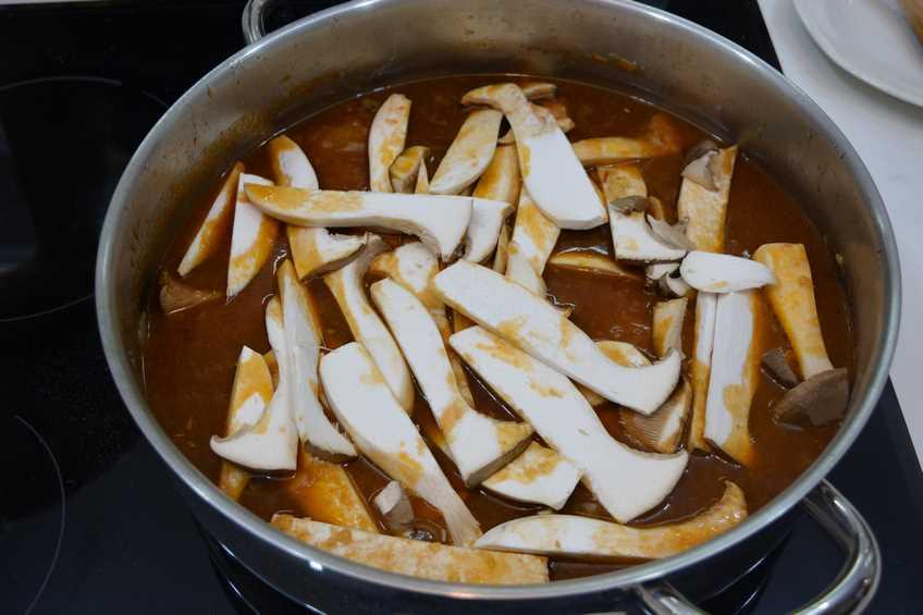 Paso 5 Añadimos un poco del caldo de carne y dejamos que se cocine todo junto durante 5 minutos a fuego lento. Pasaodo ese tiempo ponemos la carne, las setas picadas, el vino y el resto del caldo. Dejamos que se cocine durnate una hora más o menos y si pasado ese tiempo la carne sigue muy dura, solo tenéis que dejarlo más tiempo.