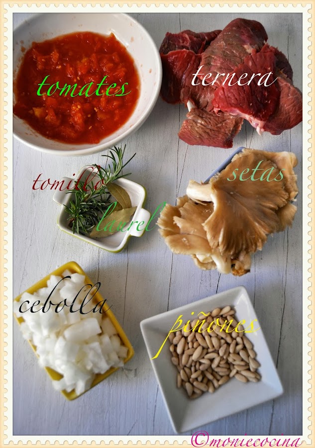 4. Incorporamos la carne y añadimos un vaso de vino blanco, si se ve muy seco se puede añadir un poco de agua, si no así vale. Y cocemos unos 30-40 minutos, cuando veamos que la salsa está cocinada y los filetes tiernos. En los ultimos minutos añadimos los piñones, rectificamos de sal y listo.