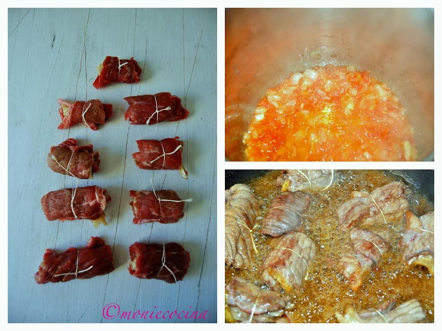 2. Salpimentamos los filetes y colocamos dentro de cada uno una seta, enrollamos y hacemos un paquetito con hilo de cocina. Así todos los filetes.
