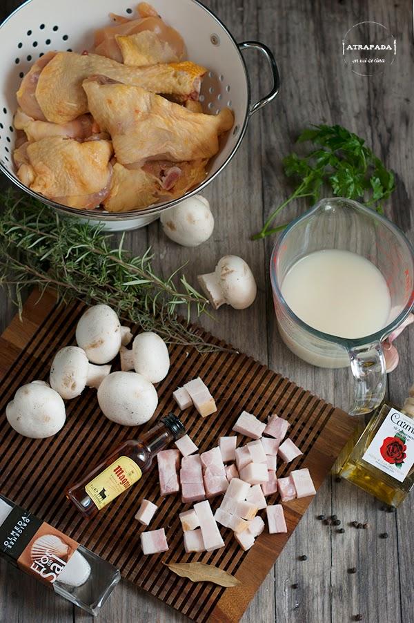 En una olla de fondo grueso agregamos unas cucharadas de aceite de oliva y añadimos el pollo salpimentado, doramos por uno de los lados durante unos cinco minutos. Damos la vuelta y añadimos el bacon cortado en taquitos, los ajos pelados y aplastados y los champiñones cortados. Mezclamos todo y añadimos el laurel, tomillo y romero. Incorporamos el cognac y flambeamos con la ayuda de un soplete. Dejamos hasta que el fuego desaparezca. Bajamos el fuego y cocemos a fuego lento unos minutos. Añadimos el caldo de pollo y llevarlo a ebullición a fuego lento durante unos diez minutos, luego tapamos la olla y dejamos una media hora más, hasta que la carne esté totalmente cocinada. Sacamos el pollo, dejamos reducir el caldo en el fuego. Servimos el pollo regado por el caldo que os quede (si queréis que os quede más salsita le añadís un poco más de caldo al principio).