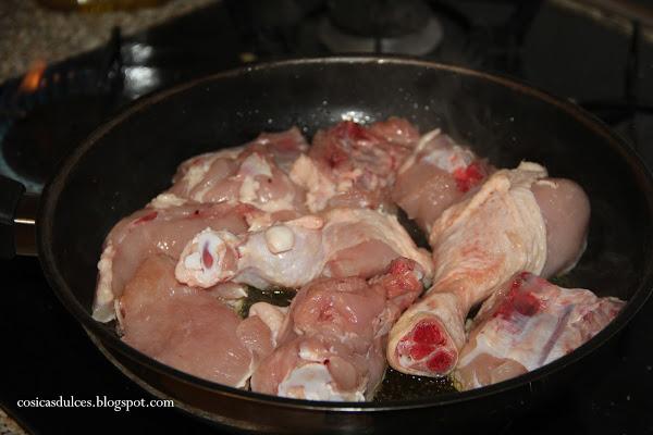 Comenzamos dorando el pollo, que previamente habremos sazonado, en una sartén con aceite caliente.