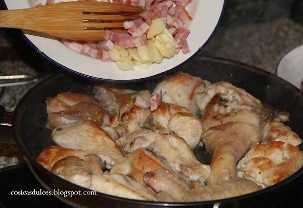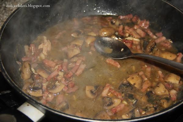 Una vez dorado, añadimos el beicon, el ajo machacado y los champiñones.