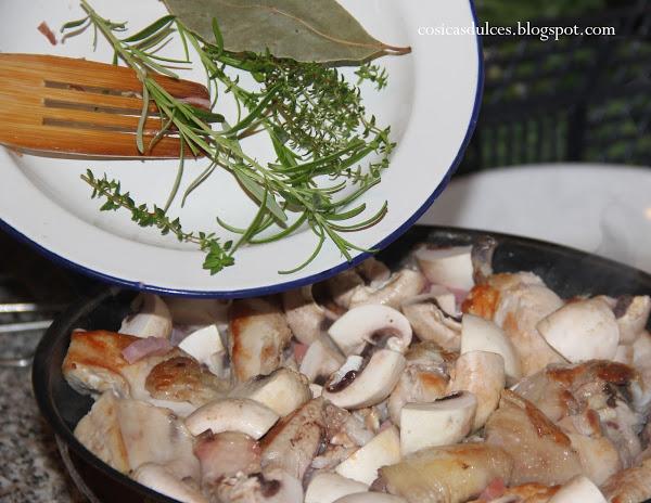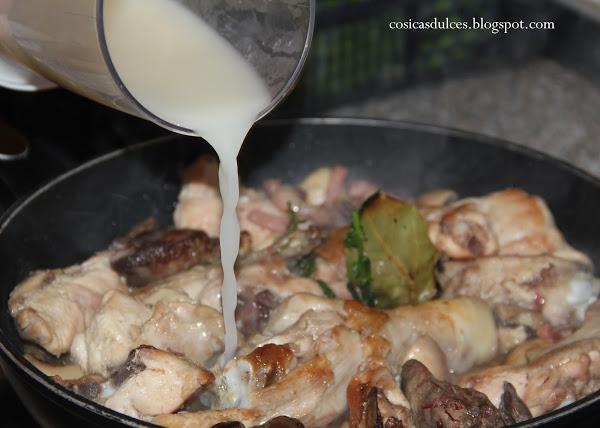 Una vez flambeado regamos con el caldo de pollo y cocinamos a fuego flojo sin tapar durante 10 minutos. Luego tapamos y dejamos cocinar unos 15 minutos más.