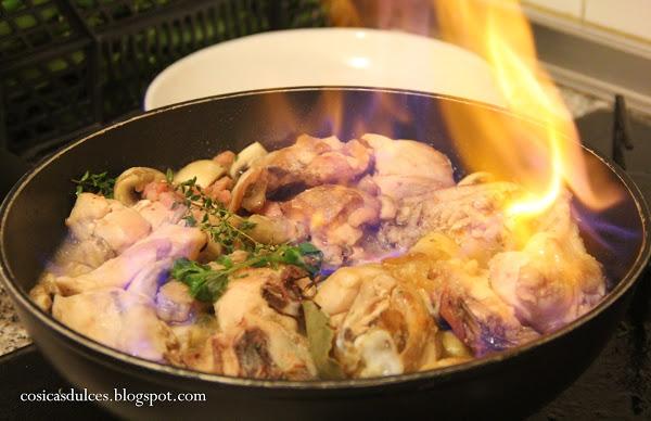 Dejamos cocinar un par de minutos y regamos con el coñac que debemos prender y dejar flambear hasta que se apague por sí sola la llama.