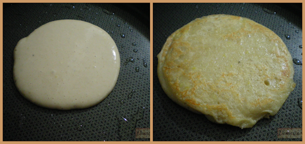 Echamos un poco de nuestra mezcla con la ayuda de un cucharón y dejamos que se vaya cuajando. Si queremos que queden unas tortitas finas, podemos mover la sartén para que se extienda la masa, sino, la dejaremos tal cual caiga del cucharón. Cuando esté dorada por una cara, le damos la vuelta hasta que se haga por la otra. La sacamos de la sartén y repetimos la operación hasta terminar con la masa.