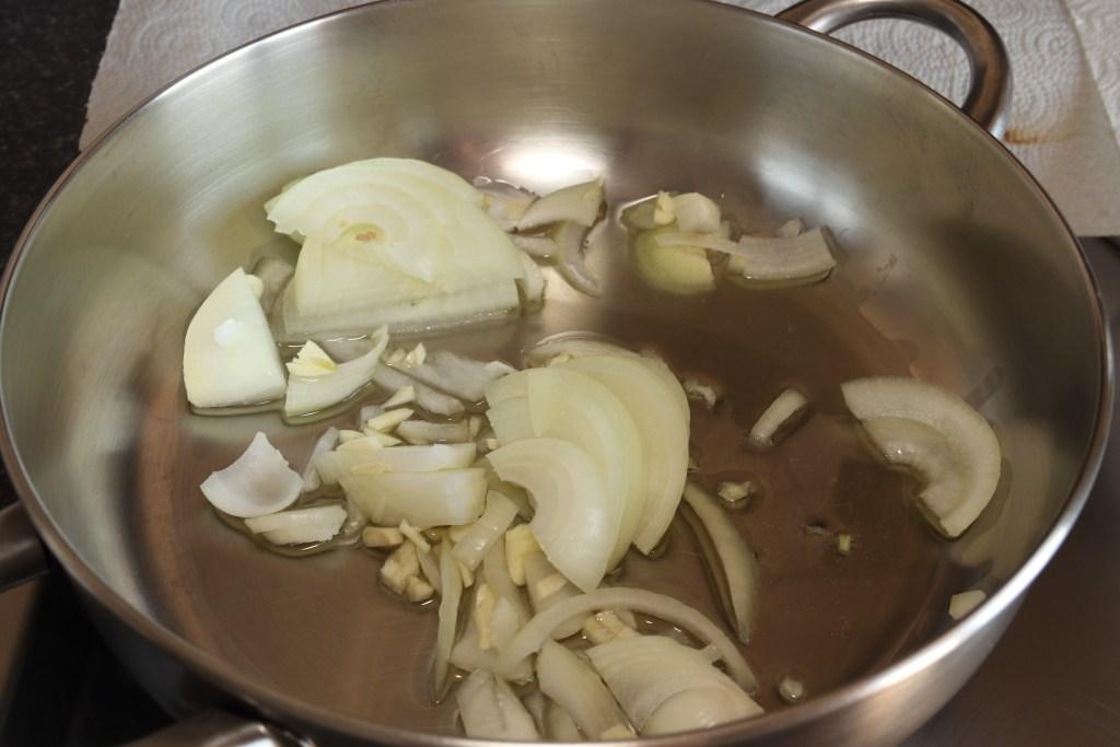 Limpiamos la cebolla y los ajos, picamos finamente y pochamos en una cazuela baja y amplia con un chorro de aceite de oliva y a fuego suave.