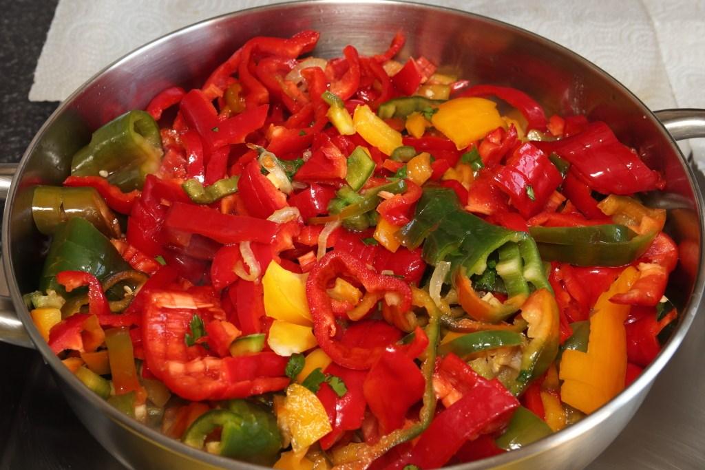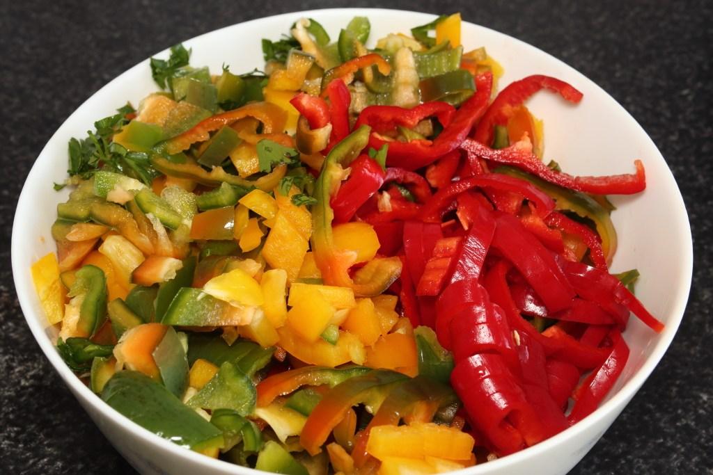 Lavamos los pimientos, retiramos pedúnculos y pepitas y troceamos en tiras no muy gruesas, lavamos también el perejil y picamos, reservamos.