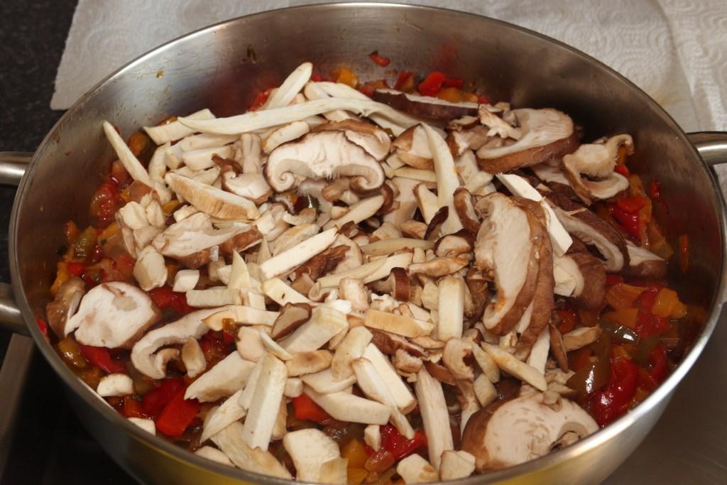 Una vez que la cebolla y el ajo estén tiernos añadimos los pimientos y el perejil. Dejamos que se hagan a fuego medio, sazonamos, y removemos de cuando en cuando. Por último incorporamos las setas, mezclamos todo bien, dejamos unos 5 minutos, que se hagan las setas, rectificamos de sal y a disfrutar.