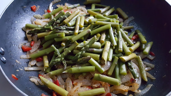 4. - Cuando estén los espárragos, los troceamos y los añadimos a la cebolla, y le añadimos un poco de sal, pimienta, orégano y nuez moscada y dejamos cocinar un par de minutos más. Apartamos y reservamos.