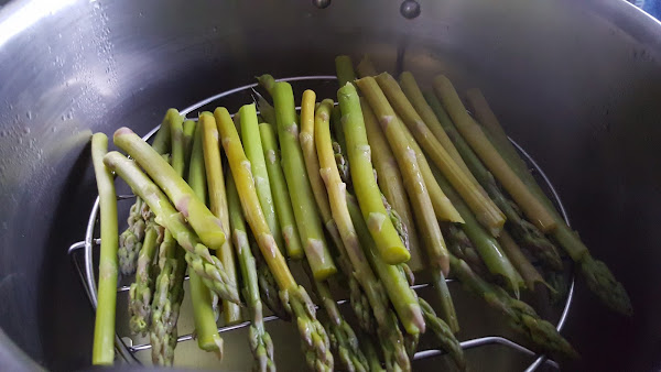 1. - Cocinamos al vapor los espárragos, que habremos lavado y quitado as partes duras,durante 15 minutos, yo utilizo la rejilla del microondas y la meto en una cacerola grande con un poco de agua.