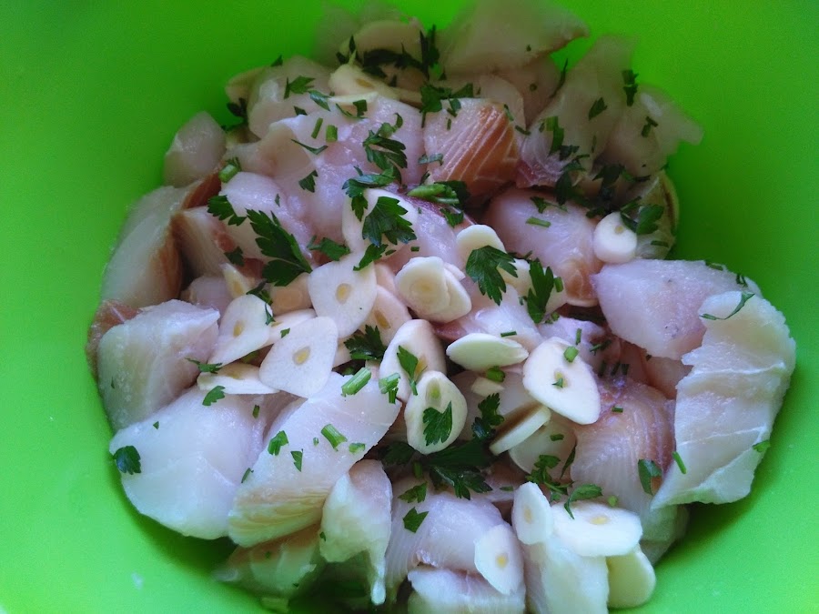 Se parte el cazón en tacos de bocado, se añade sal, ajo fileteado, perejil cortado y el zumón de 1 limón