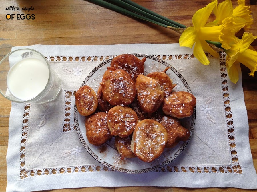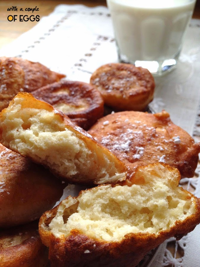 Pasan de generación en generación. A mi abuela se los enseñó a hacer mi bisabuela y así sucesivamente. Aunque "la receta original corre el peligro de extinguirse". Ya que mi madre a veces le da el punto creativo y los cambia un poquito (le añade trozos de manzana o trozos de chorizo a la mezcla). Y yo, como hija de mi madre que soy, también les doy mi toque. En este caso espolvoreándolos con canela. Como podéis comprobar, esta masa de fritos da mucho juego.