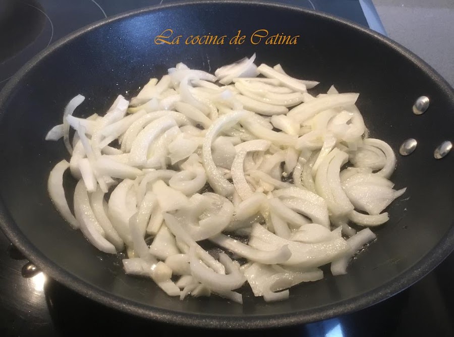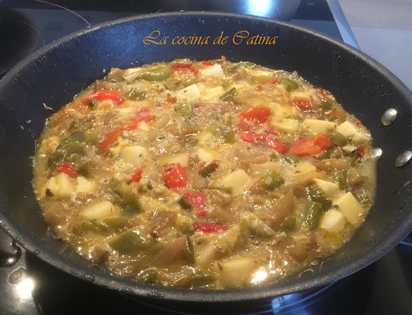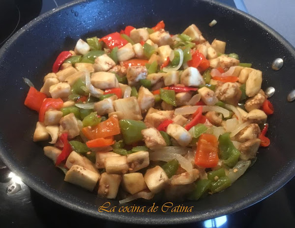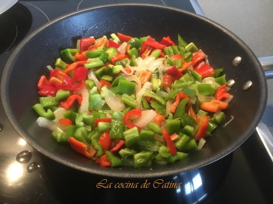 Pelamos y cortamos todas las verduras en juliana, primero salteamos la cebolla a fuego lento durante 5 minutos, añadimos los pimientos y freímos durante 10 minutos más. A continuación incorporamos la berenjena, si tapamos la sartén con una tapadera, se blandearán mejor las verduras.