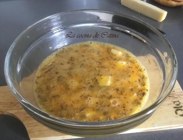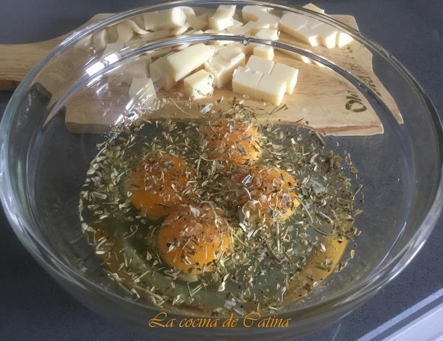 Cascamos los huevos en un bol grande, añadimos sal, pimienta, los 100 gr de queso cortado a cuadraditos, las hierbas provenzales y la nata (crema de leche), batimos bien para que se mezcle todo.
