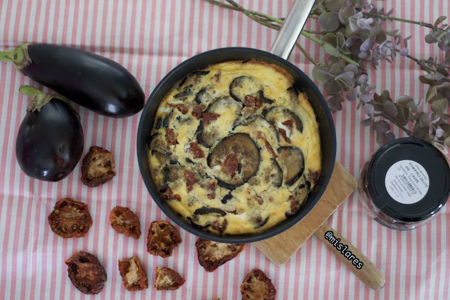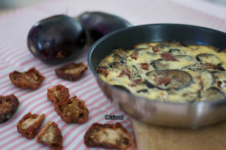 4. Colocamos en una sartén de 20 cm. de diametro la mezcla de huevos, colocamos encima la berenjena y tomates fritos e introducimos 20 minutos en el horno precalentado a 190 grados.