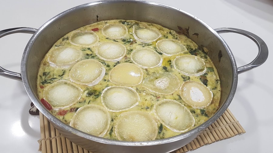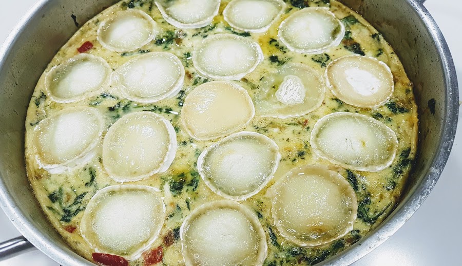 Cortamos el queso de cabra en rodajas y las colocamos por encima de la mezcla del huevo. Metemos la sartén en el horno y la dejamos unos 8 minutos, hasta que el huevo cuaje