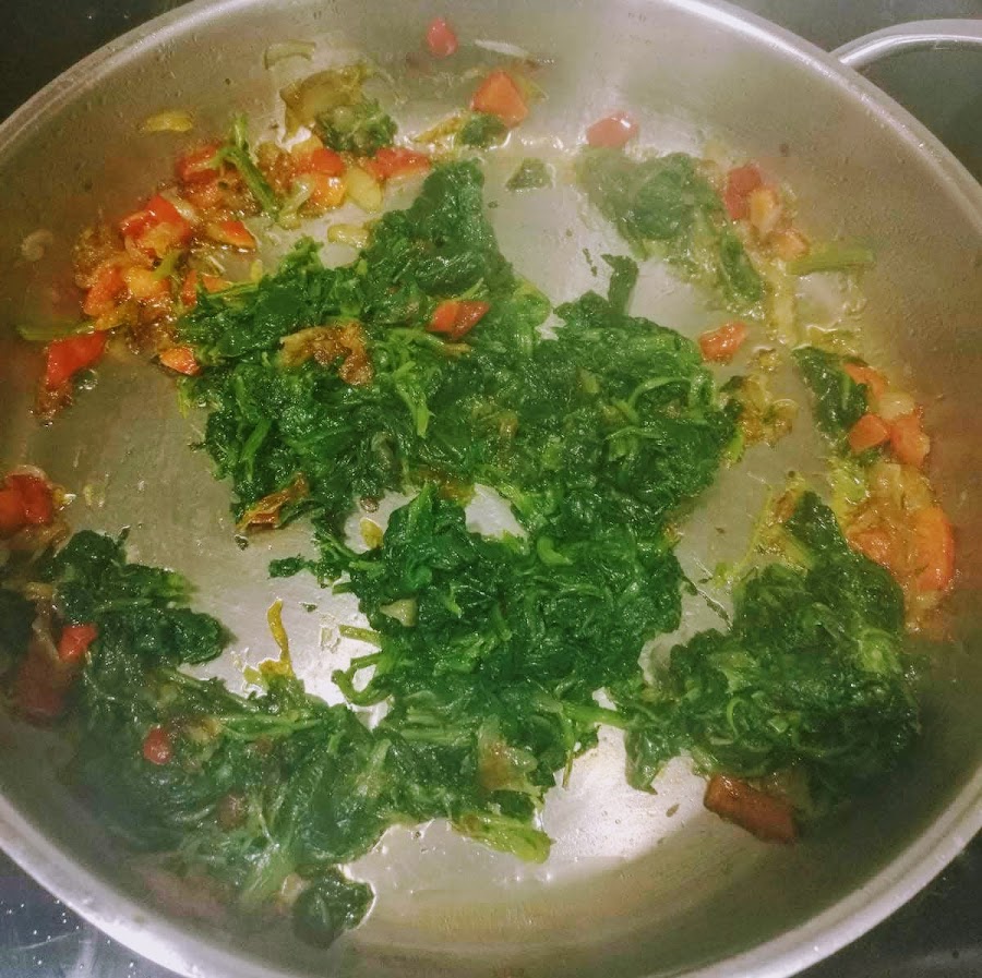 Añadimos las espinacas a la sartén y dejamos que se ablanden. Mientras tanto echamos los huevos en un cuenco, añadimos sal y batimos bien