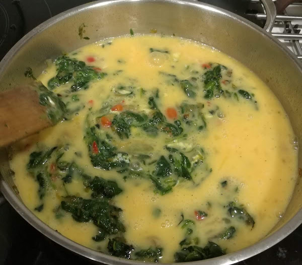 Añadimos los huevos y removemos con una espátula. Dejamos al fuego un par de minutos para que el huevo empiece a cuajar