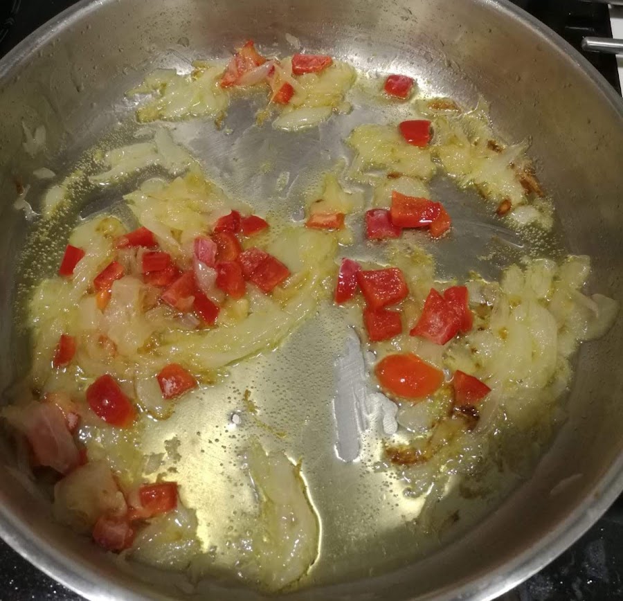 Cuando esté tierna añadimos el pimiento rojo picado en cuadraditos muy pequeños. Dejamos el pimiento y la cebolla en la sartén a fuego muy bajo, para que la cebolla caramelice (quedará muy blanda y con un ligero tono marrón, cuidado de que no se queme)