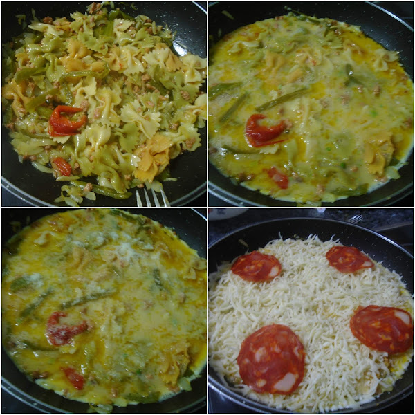 Incorporamos la pasta, mezclamos bien con la cebolla y los pimientos, a continuación añadimos los huevos y cuando empiece a cuajar, retiramos del fuego y añadimos un poco queso parmesano en polvo y la mozarella junto con una rodajas de chorizo.