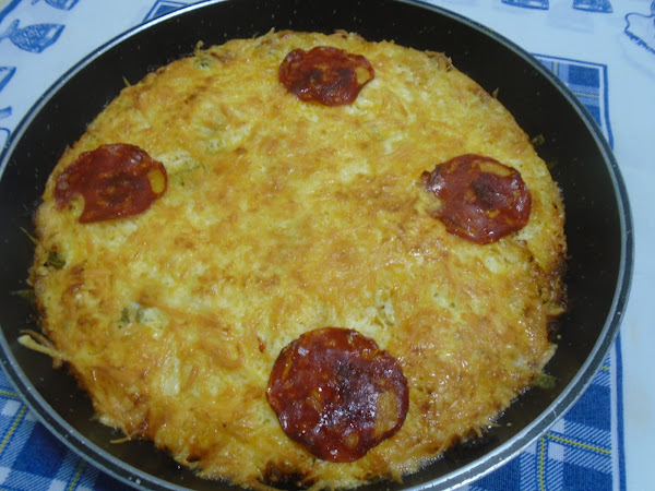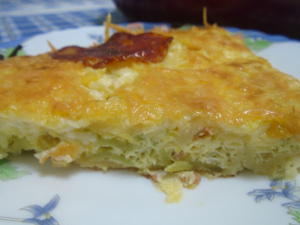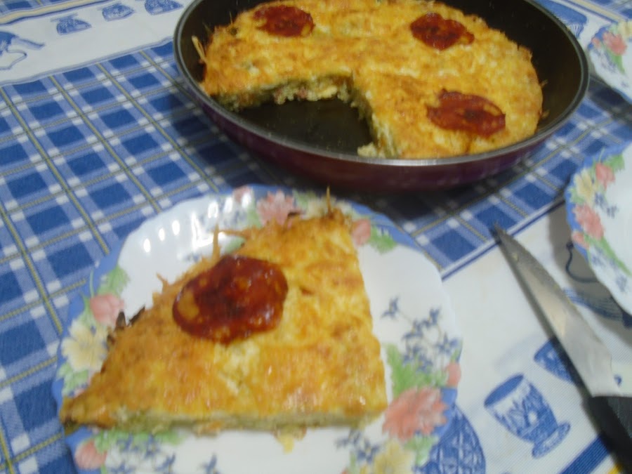 Es una receta de aprovechamiento total, solo tenemos que freír la cebolla, dejándola cocer a fuego suave para que se vaya ablandando, se le añaden los pimientos cortados en tiras y una vez, que se haya caramelizado la cebolla, añadimos los restos que tengamos en la nevera ( en mi caso, añadí lazos de pasta con carne picada, los huevos, queso parmesano en polvo y mozarella, metemos en el horno y la dejamos cocer unos 12 o 15 minutos dependiendo del horno en los últimos dos o tres minutos se gratina. Se deja enfriar unos minutos y listo para comer.