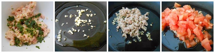 Escurrimos el aceite del atún y lo colocamos en un bol junto con el perejil, mezclando bien. Ponemos a calentar las dos cucharadas de aceite en una sartén y colocamos el ajo troceado. Cuando se dore un poco añadimos el atún con el perejil y los tomates pelados y troceados. Cocinamos 10 minutos a fuego bajo y luego dejamos enfriar.