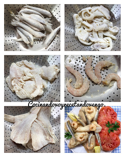 Hay que tener en cuenta que cada pescado tiene su tiempo, por ejemplo las gambas me gusta pelarlas, es un bocado delicioso, pero en el fuego es menos de un minutos el que las tenemos que tener, el resto de pescados hay que ser muy cuidadosos y no dejarlos freír en exceso, si los veis flotar, dar la vuelta para que se cocinen por ambos lados, luego una vez conseguido el dorado necesario sacar de la sartén. Los boquerones si son pequeños, les quito la cabeza y los frío con espinas, te los puedes comer con espinas y todo los "victorianos" son ideales, le puedes preguntar al pescader@.