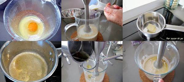 Colocar la mantequilla en un cazo al fuego, derretir y calentar a punto de avellana (cuando deja de crepitar y la mantequilla permite ver el fondo del cazo). Retirar del fuego y dejar enfriar.