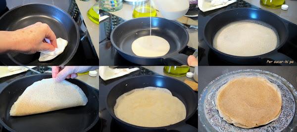Untar con un poco de aceite una sartén antiadherente y calentar al fuego. Verter una porción de masa en el centro, de manera que se vaya extendiendo por toda la superficie hasta formar una capa fina más o menos uniforme. Dejar que cuaje y darle la vuelta con cuidado de no romperlo. Cuando haya adquirido un tono dorado retirar y colocar en un plato. Ir cociendo el resto hasta agotar la masa.