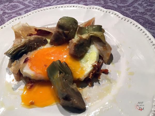Retirar el huevo frito de la sartén y colocarlo sobre el frixuelo. Plegar los lados hacia dentro y rematar con unas alcachofas confitadas (pueden ser cocidas, escurridas y salteadas en un poco de aceite).
