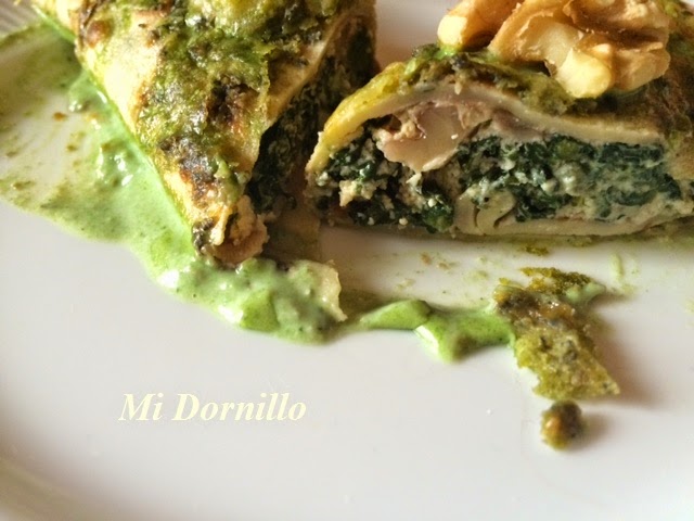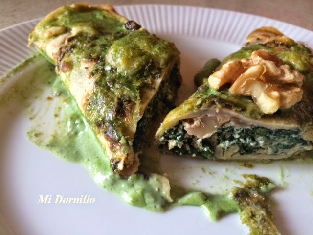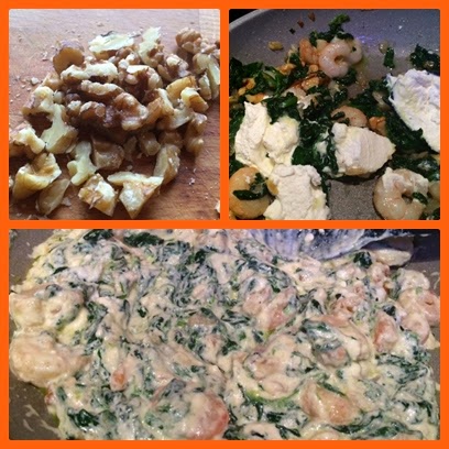 Previamente habremos picado las nueces. Añadimos a las espinacas y removemos bien. Ponemos el queso Ricotta, que es muy cremoso. Debe quedar una crema como en la foto. En este momento volvemos a rectificar de sal, y apartamos del fuego.