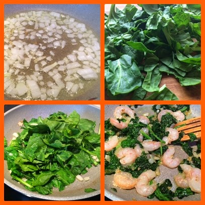 Rehogamos bien y cuando se hagan las espinacas añadimos las gambas. Salpimentamos al gusto.