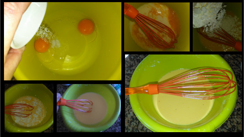 En un recipiente echamos los huevos, la pizca de sal, batimos y luego añadimos la leche, a continuación vamos añadiendo poco a poco la maicena y revolviendo hasta formar una mezcla más bien líquida. Dejamos reposar unos minutos.