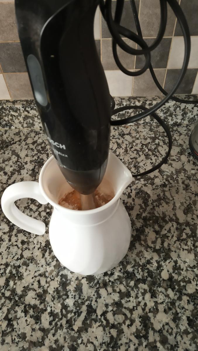 Colocar todos los ingredientes en una jarra y triturar con una batidora de mano (turmix).