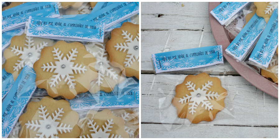 Y en otra fiesta distinta dieron estas galletas como recuerdo del cumpleaños, todo relacionado con el mundo de Elsa y Anna. Es algo original y que gusta mucho.