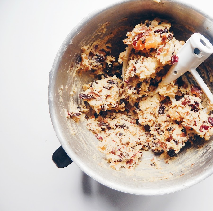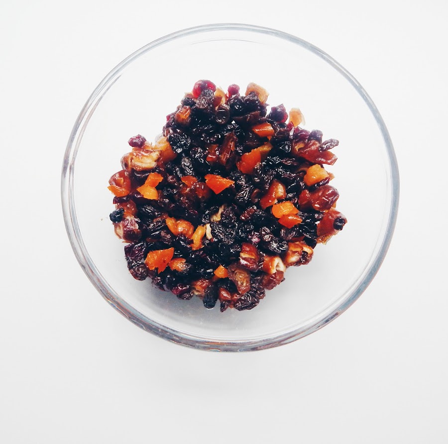 Uno de los pasos importantes en estas galletas es macerar las frutas y frutos secos durante toda la noche, o por al menos 8 horas. Haremos una mezcla con un poco de jugo de limón, miel y licor.
