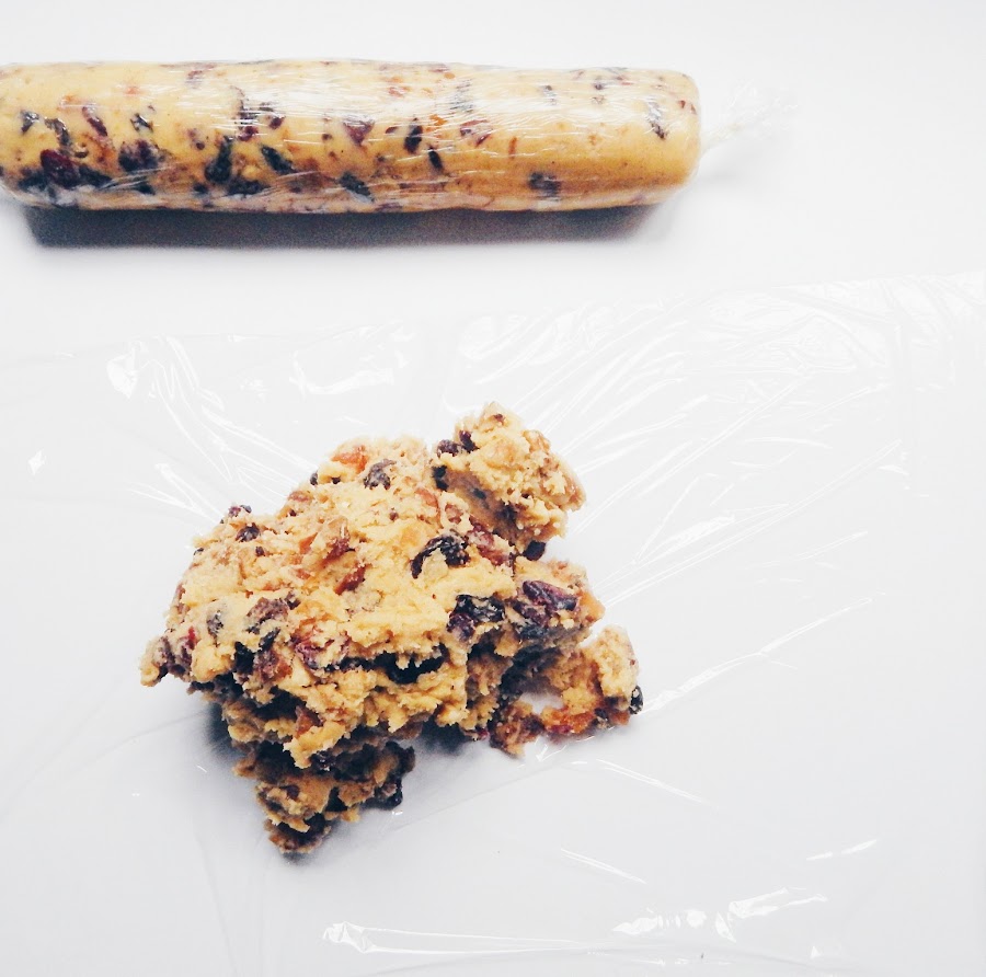 Dividimos la masa en dos y ponemos cada una en un trozo de plástico adherible de 30 x 45 cm. Enrollamos y cerramos los extremos, haciendo un tipo de caramelo. Nos deben quedar cilindros de 30 cm de largo y con un grosor de 2.5 cm (también lo pueden hacer menos o más grueso).