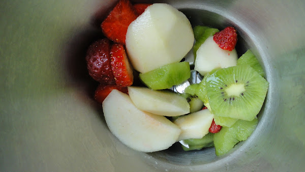 piezas de frutas peladas y troceadas. 500 gramos una vez peladas. Yo he puesto un puñadito de fresas, dos peras y cuatro kiwis.