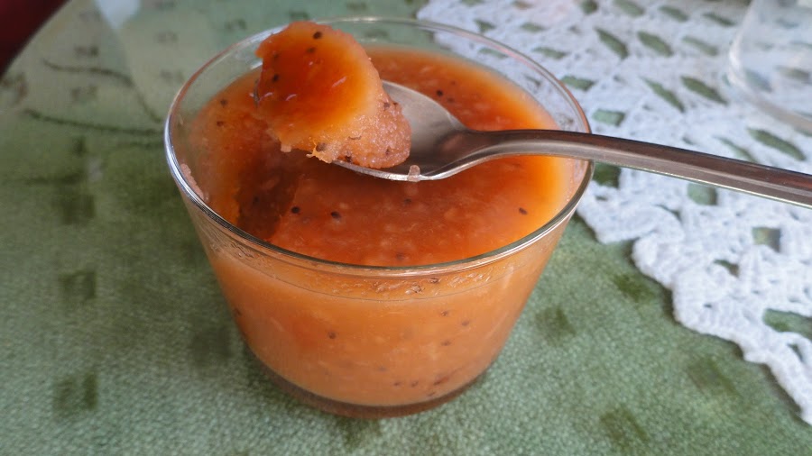 Y Sin robot pondríamos la fruta triturada con la batidora en un cazo y le agregamos el azúcar moreno, la cucharada de miel, el zumo de naranja y ponemos a fuego medio hasta que mezcle todo bien, dejamos calentar bien, sin llegar a hervir y echamos las hojas de gelatina hidratadas e igualmente ponemos a enfriar.