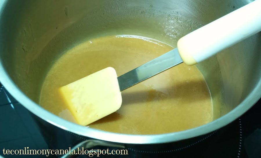 En una cazuela, calentamos a fuego lento el azúcar, la leche evaporada y la mantequilla, hasta que se disuelva el azúcar.
