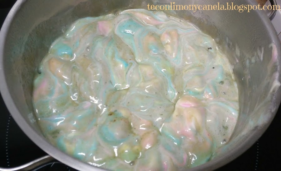 Si lo hacéis con nubes blancas o rosas imagino que os quedará una mezcla normal... Pero yo utilicé nubes de colores, y hasta el final tuve miedo del resultado de mi fudge...